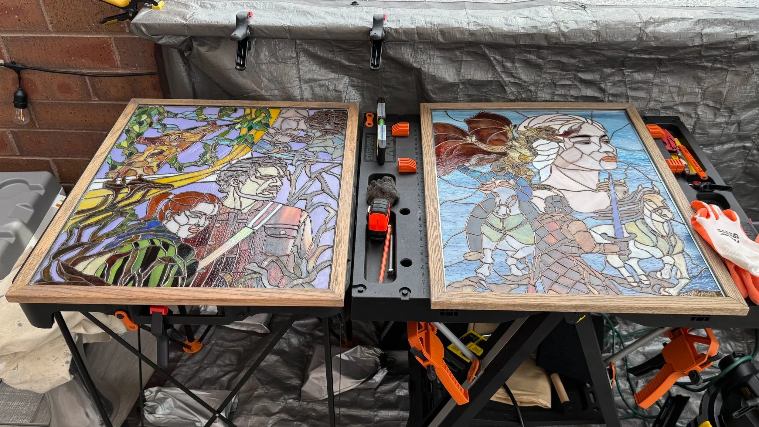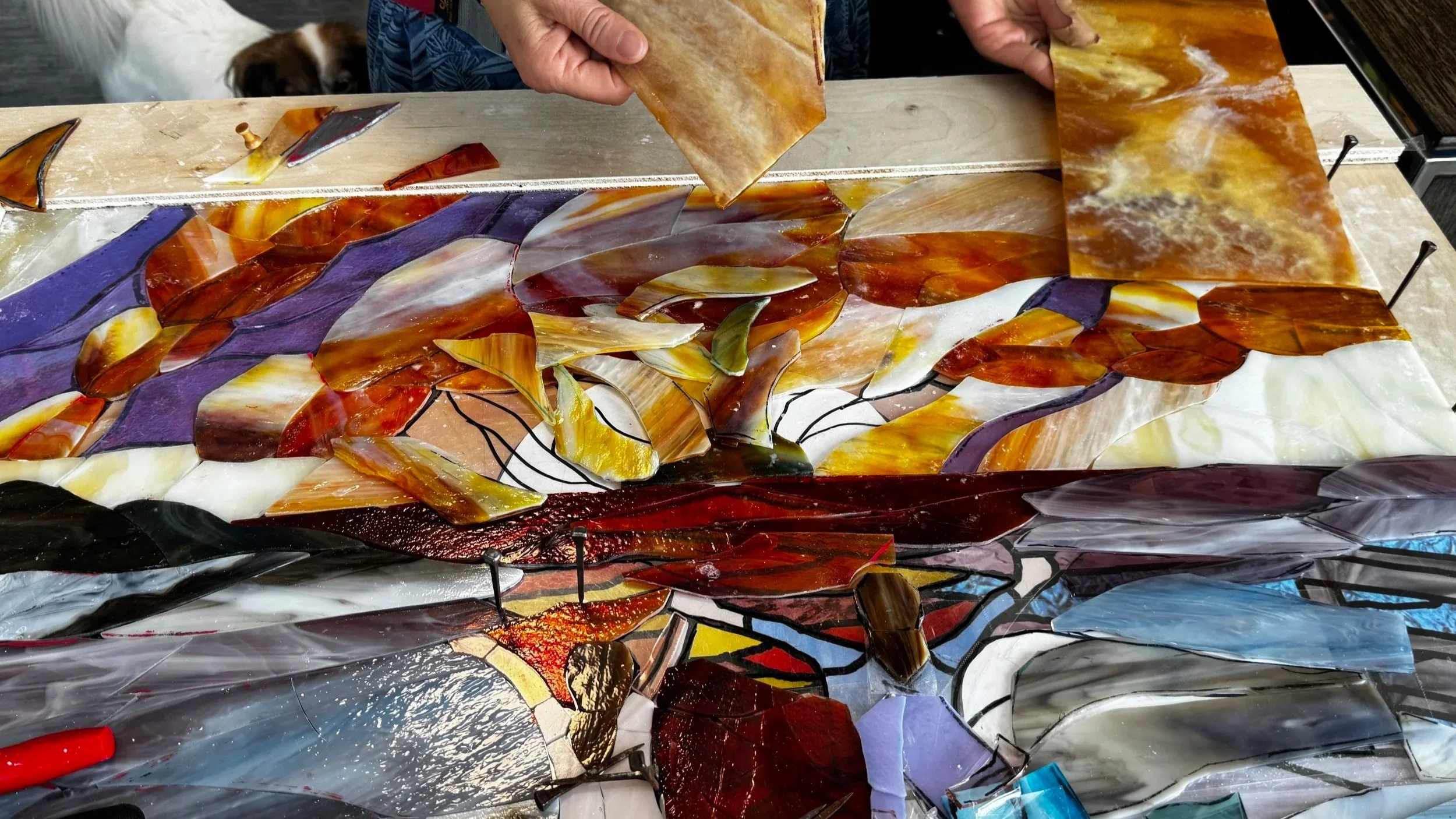 Dragon Queen break lines are drawn on the glass here with a white paint pen so Jim can more easily break each background piece exactly.