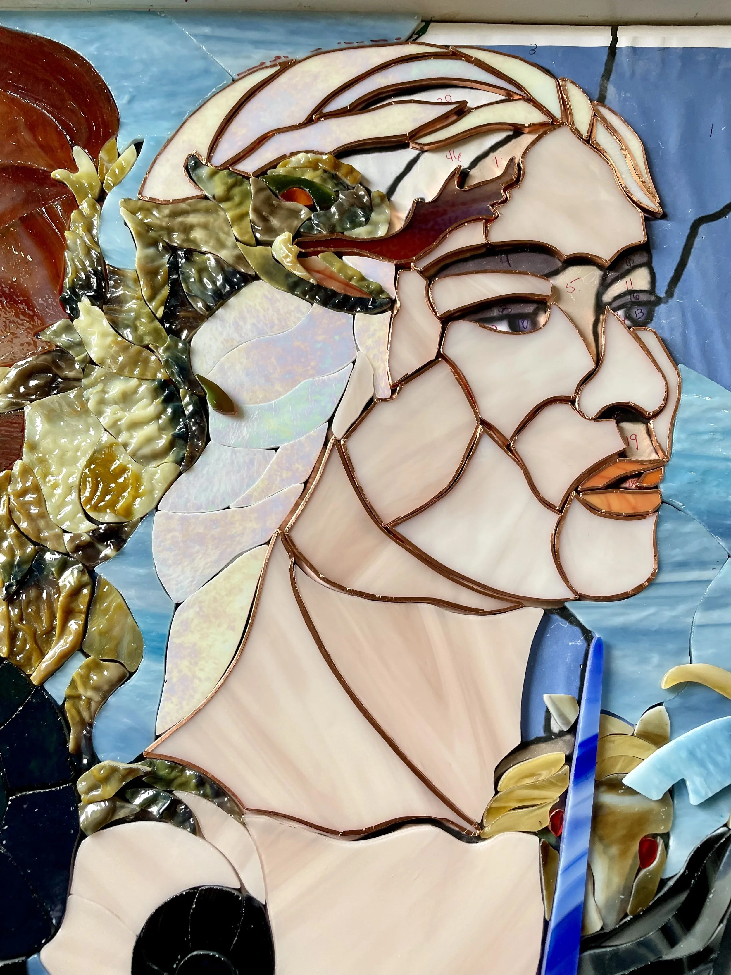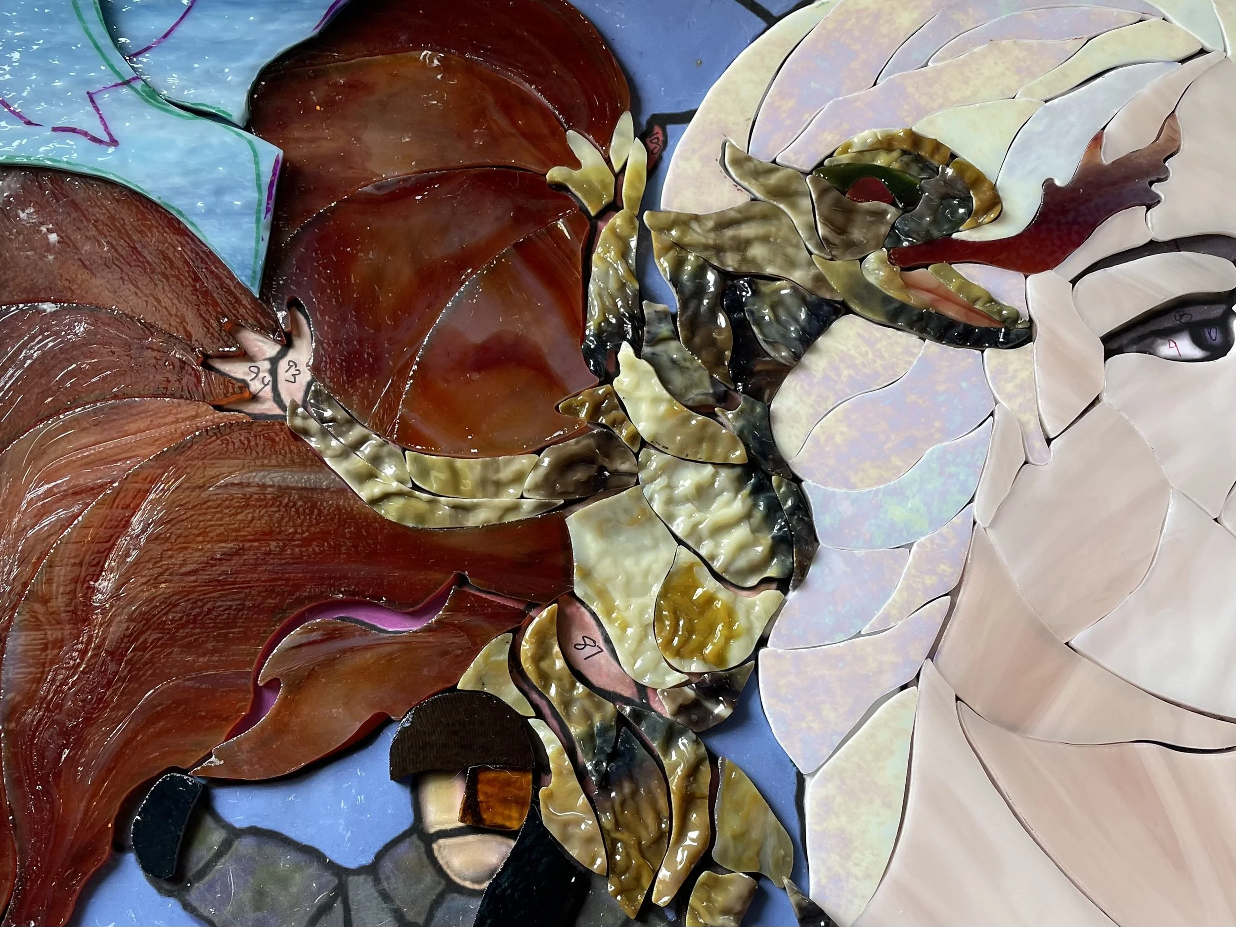 Each piece of curated glass intensifies their shared vision. To glimpse the brilliance of their glass choice, focus on the textures of the dragon in Dragon Queen: scarlet or burnt orange wings depending on light and a ribbed body with a decidedly uneven, opaque patchwork of cocoa and golden yellow. In that same work consider how the iridescent glass of the dragon queen’s hair befits her commanding presence.