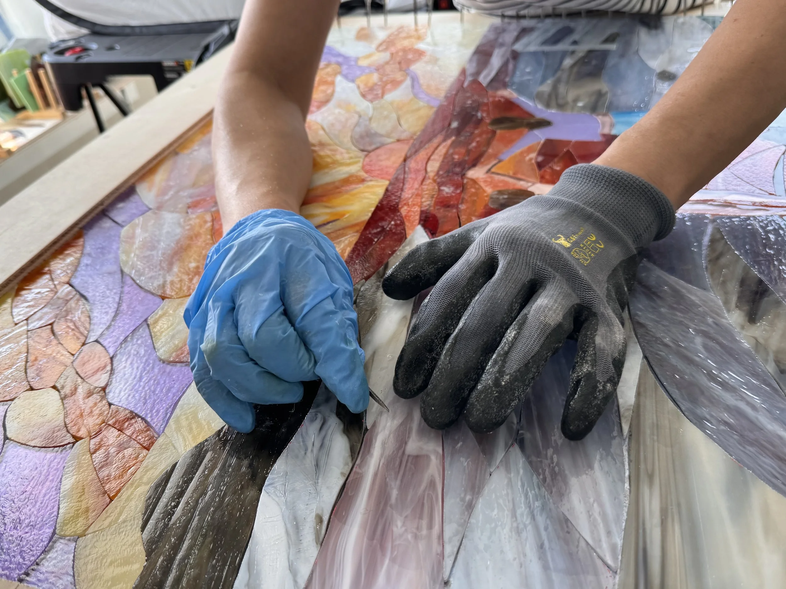 Xiumei embeds a part of the dragon’s copper-foiled glass arm.